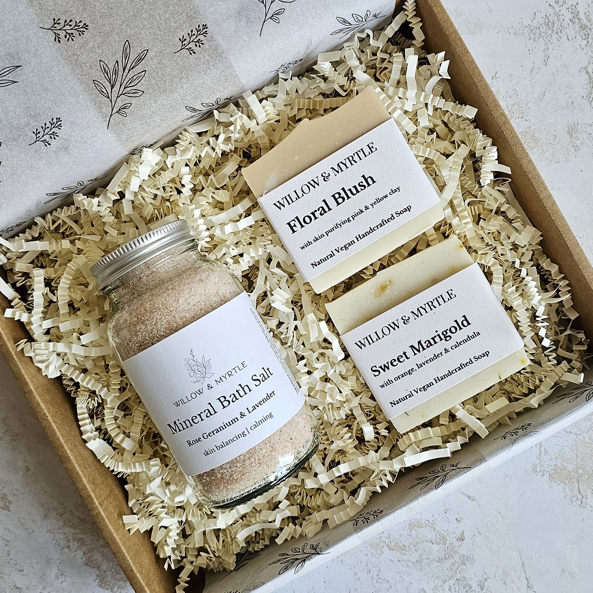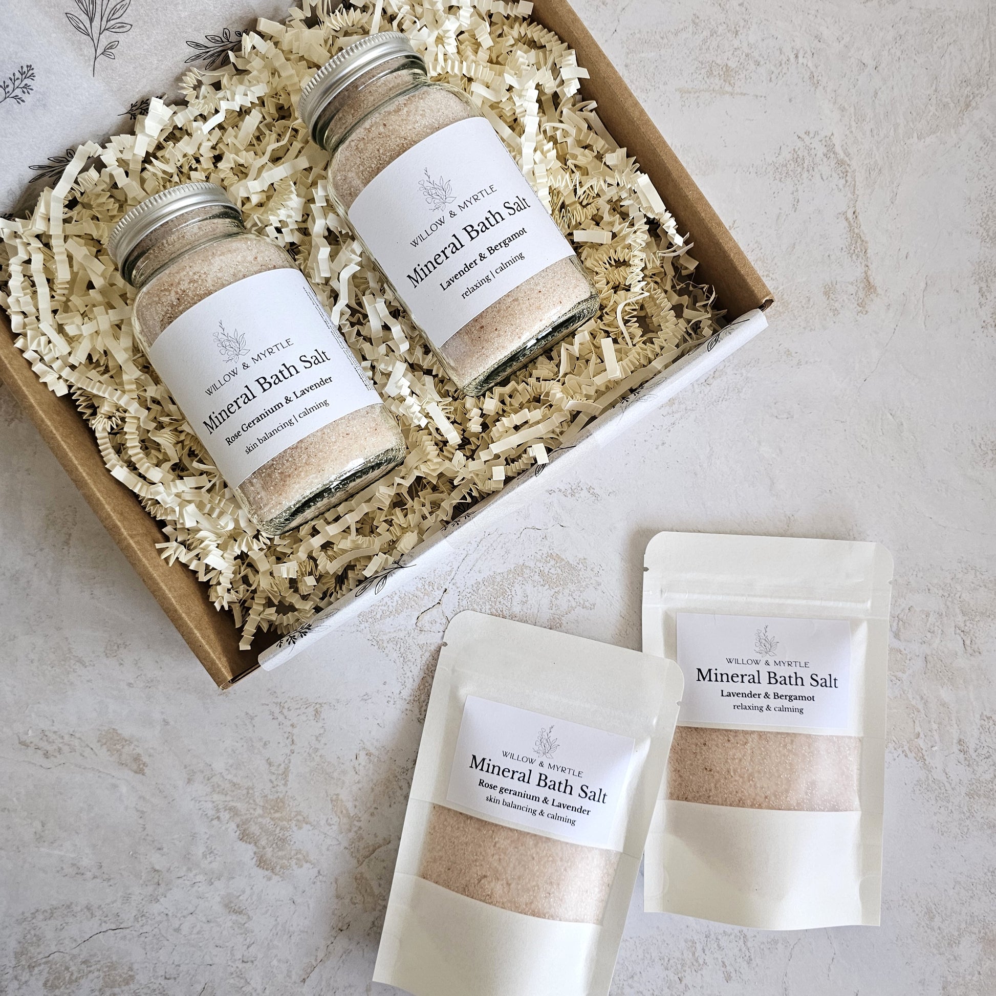 Mineral rich bath salts infused with an aromatherapy blend of essential oils to give a relaxing and soothing bathing experience.